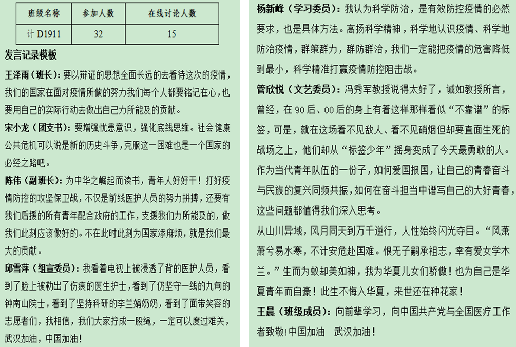 2019级材料科学与工程1班学生刘玲:此次疫情防控中,最令我震撼的是党的强大的组织动员能力,全国一盘棋,集中力量办大事!正如老师所言,中国共产党的领导是中国特色社会主义制度的最大优势!多难兴邦,我们从来不曾畏惧困难,我们始终拥有必胜的信心,这源于五千年连绵不断的文明!疫情是一面镜子,照见了真正的中国,也反射了人民群众的担当,在这里,我们看到许许多多美丽的逆行者、志愿者、捐赠者以及宅家者。身处于这样有爱暖心的国度,我内心最真实的感受是爱国,是我们最大的担当。