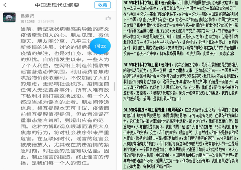 3月9日下午,校党委宣传部、教务处、百家乐论坛 、学工部积极组织思政课教师、学生工作队伍、广大学生通过人民智云客户端、咪咕视频客户端、“学习大国”微信公众号、线上课堂等方式收看由教育部社会科学司、人民网联合举办“全国大学生同上一堂疫情防控思政大课”。直播结束后,各百家乐论坛 通过组织线上课堂讨论、班级征集学习心得、微信分享收看体会等,引导学生加深对课程内容的理解,提升思政大课收看效果。广大师生纷纷表示,从别开生面的思政大课中深刻领会到了“中国精神、中国力量、中国智慧、中国速度”所彰显的社会主义制度优越性,进一步增强了万众一心战胜疫情的信心,也更加坚定了奋发图强、努力进取,为祖国建设贡献青春力量的决心。