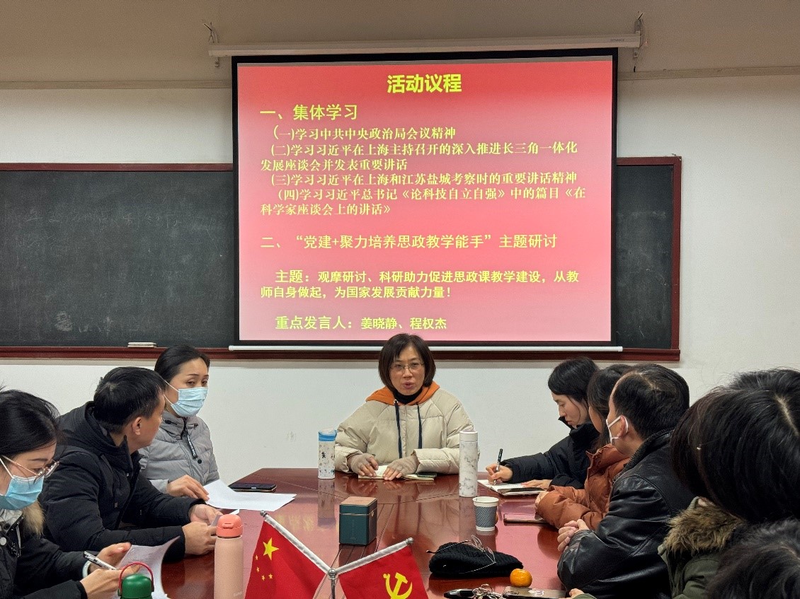 会议分为“集体学习”和“‘党建+聚力培养思政教学能手’主题研讨”两个阶段。第一阶段,全体党员在于春莉带领下,集体学习了12月8日召开的中共中央政治局会议精神、习近平总书记在深入推进长三角一体化发展座谈会上的重要讲话精神、习近平总书记在上海和江苏盐城考察时的重要讲话精神等相关内容。大家纷纷表示,要深入学习领会中共中央政治局会议精神,落实新时代党的建设总要求和新时代党的组织路线,坚决贯彻党中央决策部署,立足本职为国家发展贡献力量,认真履职尽责,持之以恒做好教书育人工作。