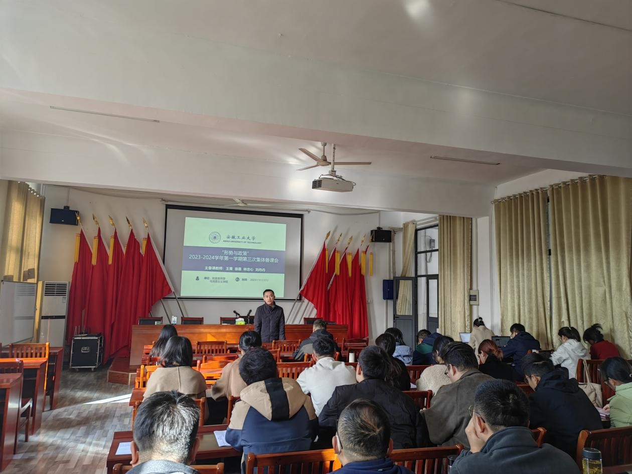 会上,林忠心强调认真做好“形势与政策”课程集体备课的重要意义。他指出,“形势与政策”是思政课必修课之一,每学期授课专题和教学任务都有很大的变化,涉及的学科跨度也较大,更要求全体授课教师要在思想上高度重视,在行动上坚决落实,努力做到讲准、讲深、讲透、讲活,教育引导大学生正确认识世界和中国发展大势、中国特色和国际比较、时代责任和历史使命、以及远大抱负和脚踏实地,发挥其作为立德树人“关键课程”的主渠道、主阵地的作用。随后,姚礼巧、邱浩、张晶晶等3位专题备课负责人分别从“深刻认识国家安全总体形势”“新时代党解决台湾问题的总体方略”“世界变乱交织 中国笃行担当”三个专题进行了授课展示,强调教学目标和授课内容的重点难点。最后,刘丹丹就本课程如何进一步规范管理、细化过程考核、期末考试安排等具体任务进行详细说明,并要求全体授课教师按照课程教学大纲和集体备课所确定的教学方案认真准备,认真上好每个教学专题。
