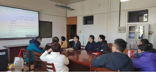 教学事故认定与处理办法》等文件,强调与会教师要严格遵守规章制度,维护良好的教学秩序,不断提升教学质量。接下来,祝小迁老师以“四史”教育类选修课《<大学>与人生智慧》第一讲《明德与明明德》,进行说课展示。祝小迁老师以“教学目标”“教学重难点”“教学方法”“教学过程”“分享互动”“实践任务”等内容进行阐述,对“明德与明明德”“什么是德”“什么是明德”“什么是明明德”进行了讲解,结合校训“精工博学、厚德敏行”中“厚德”的内涵进行了阐释,不断加强理论与实践的关联度。