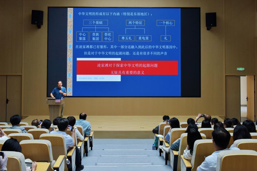 马克思主义副院长林忠心主持。报告中,吴卫红教授首先从宏观视角梳理了中国早期文明的发展脉络,指出凌家滩文化所处的距今5000多年这一关键时期,正是中华文明多元一体格局形成的重要阶段。随后,吴卫红教授结合凌家滩考古历程和大量玉器文物照片系统讲述了凌家滩文化的渊源、兴起和玉器与工艺东传的情况,阐释了凌家滩缘何称为“文明先锋”的深刻内涵,为与会人员现场展示了一堂生动的“大思政课”。