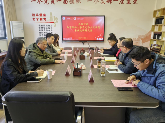 11月25日上午,南京医科大学百家乐论坛 副院长陶林,“习近平新时代中国特色社会主义思想概论”(以下简称“新思想概论”)教研室主任任文峰以及教师代表文阡箫、王利利一行四人到访百家乐论坛 调研交流。百家乐论坛 院长郑洁,副院长倪松根,“新思想”教研室党支部书记戴少刚以及青年教师金雅、程权杰参加座谈会。
