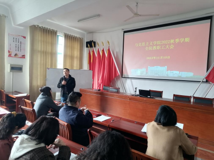 院党委副书记、纪委书记、副院长林忠心就近期承办校第九届青教赛决赛、举办新进教师试讲测评活动以及完成2021-2022学年度教学质量评价等工作进行了通报说明,并布置了本学期后期教学工作任务,尤其强调各门课程要形成和完善党的二十大精神融入教学专题方案并强化集体备课,及时完善教务系统网络资料的填写,并对教师教学考核要求做了说明。