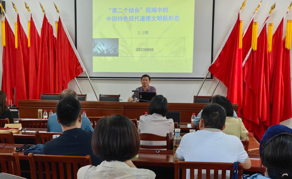 王习胜教授以“‘第二个结合’视域中的中国特色现代道德文明新形态”为主题作学术讲座。讲座由副院长宫晓虹主持,全院师生参加。
