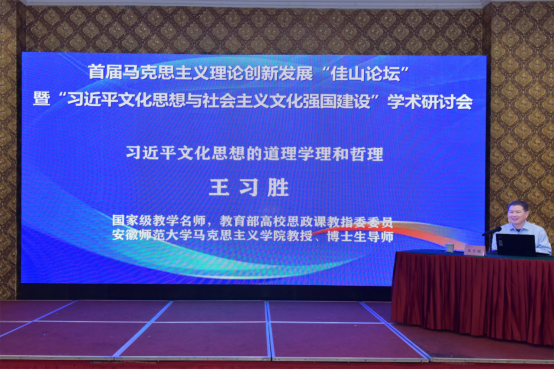 博士生导师王习胜教授以“习近平文化思想的道理学理和哲理”为题,具体解读和阐释了习近平文化思想从道理层面、学理层面和哲理层面所包涵的理论意蕴和丰富内涵,以及习近平文化思想洞察文化建设本质的哲学智慧。